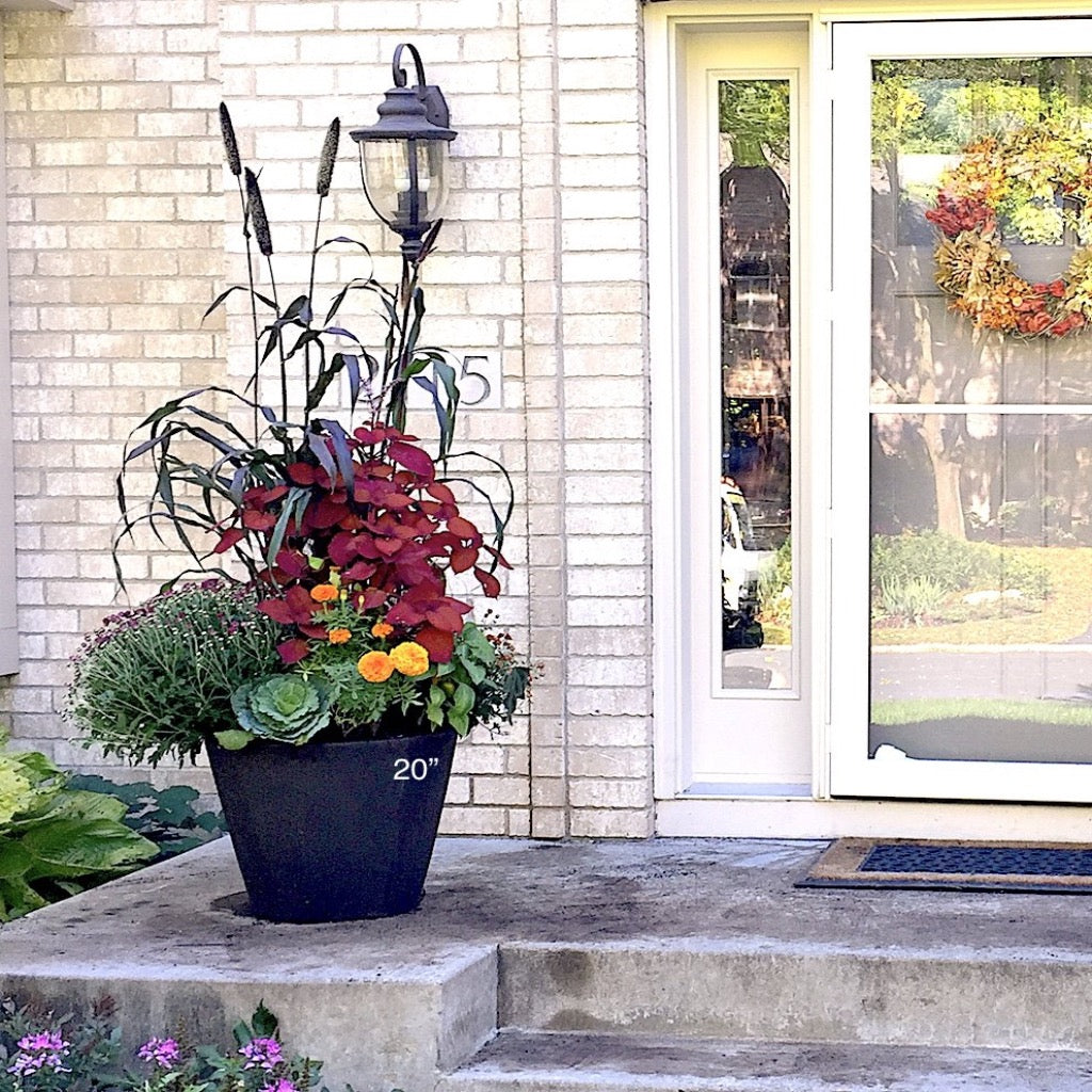 This huge planter is pure autumnal magic! It’s like a little burst of fall right by your doorstep. I love the mix of textures and colors – the deep reds, warm yellows, and lush greens create such a vibrant display.