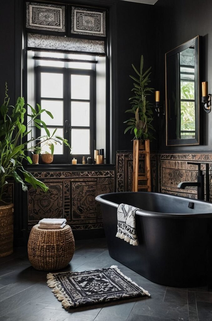 Deep, dark walls create a dramatic and moody atmosphere in this large bathroom. A freestanding oval tub becomes a focal point, its sleek lines contrasting with the textured walls. Patterned tiles add visual interest and a touch of vintage style.