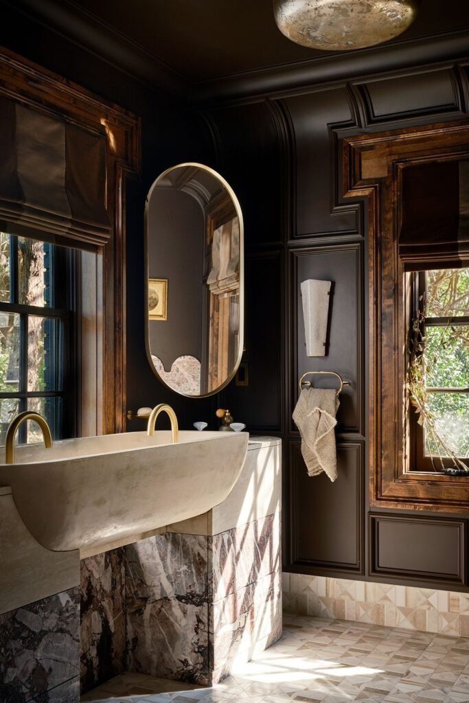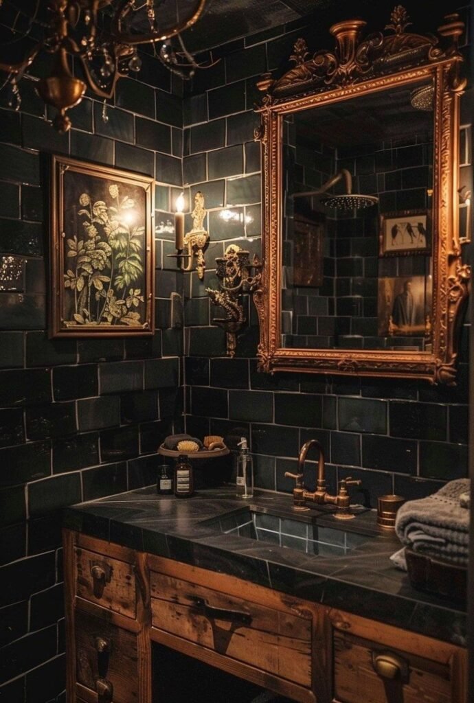 The mix of textures and materials creates a luxurious and visually interesting space. The fixtures blend seamlessly with the room’s overall moody and vintage-inspired aesthetic.