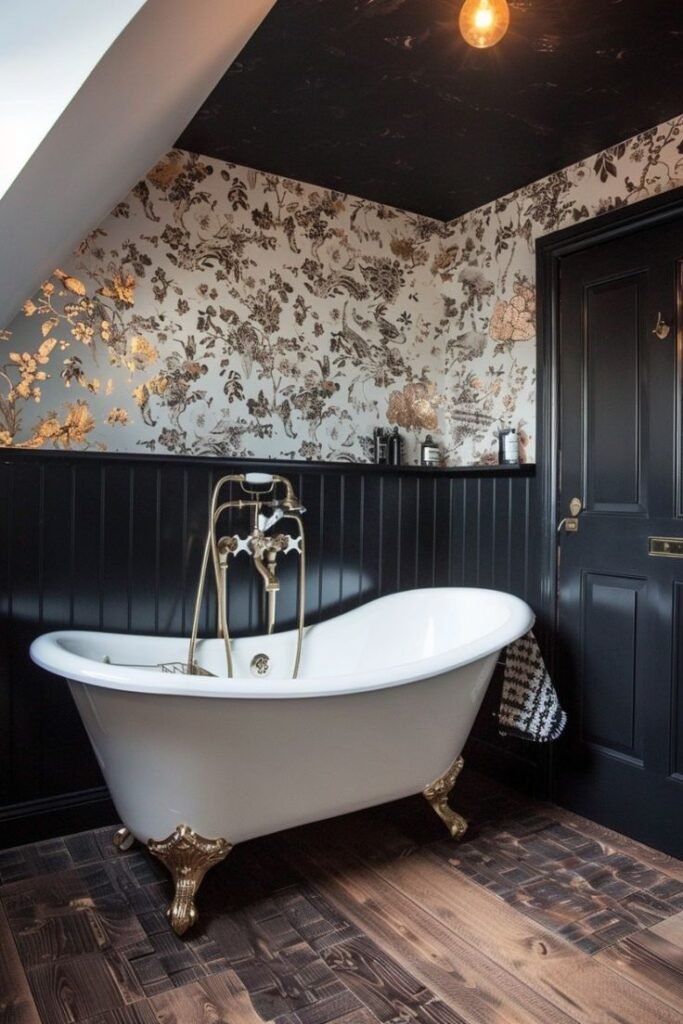 Bold, patterned wallpper makes a statement in this small bathroom, adding visual interest and depth. A clawfoot tub fits perfectly beneath the slanted ceiling, creating a cozy bathing nook. A simple pendant light provides ambient illumination.