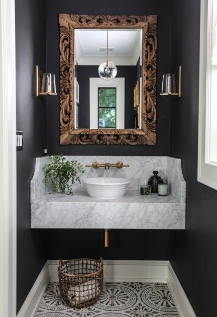 A vertically mounted vanity with a marble countertop maximizes space. An ornately framed mirror reflects light and adds a touch of vintage glamour. The dark walls create a dramatic backdrop, making the space feel cozier.