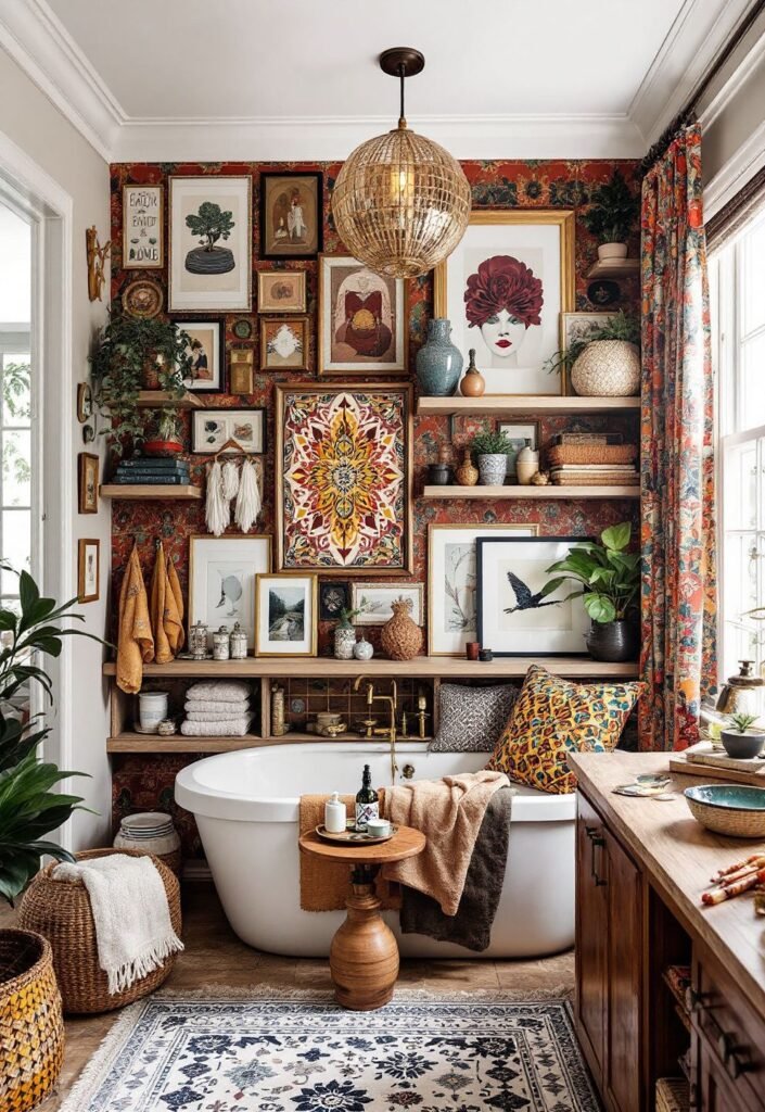 A freestanding bathtub with claw feet sits prominently in the foreground, hinting at luxurious soaks. The patterned floor adds visual interest and complements the rich textures of the walls. A decorative ceiling light provides subtle ambient lighting.
