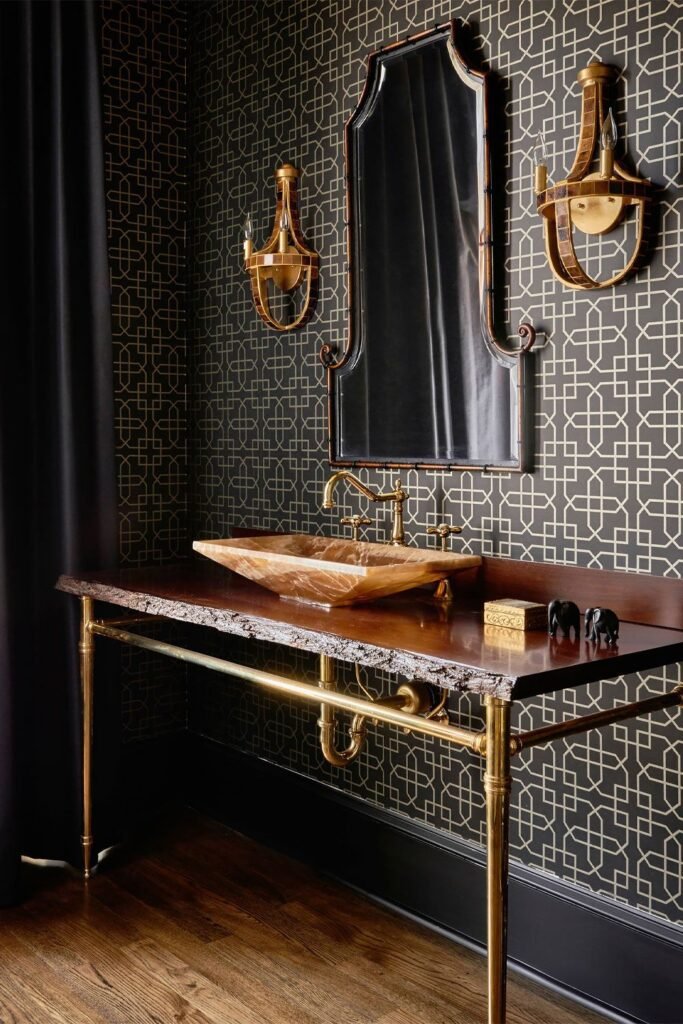 A sleek, modern vanity with brass legs and a live-edge wood top anchors the space. A vessel sink sits atop the counter, adding a contemporary touch. The dark walls and patterned wallpaper create a moody backdrop. A unique, arched mirror and matching sconces add a touch of vintage glamour.