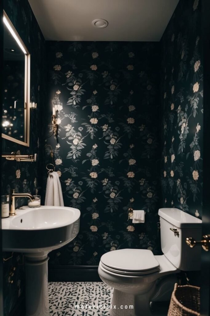 Dark, floral wallpaper makes a bold statement in this small powder room. A classic white pedestal sink provides a clean contrast to the dramatic walls. Gold accents, including the faucet and sconce, add a touch of elegance.