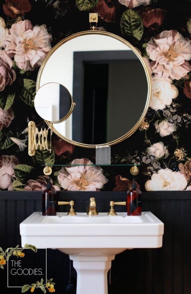 Bold floral wallpaper creates a dramatic backdrop in this small bathroom. A modern, white pedestal sink offers a clean contrast to the vintage-inspired walls. A round mirror with a gold frame complements the warm tones of the wallpaper.